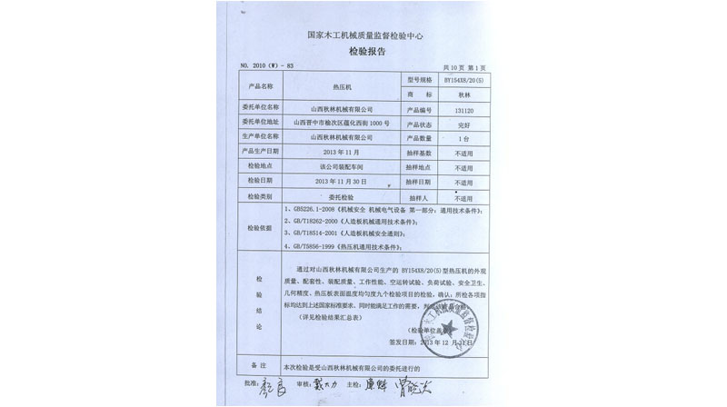 BY21型熱壓機、BY624×8/16、BY154×8/20(5)通過國家木工機械質量監(jiān)督檢驗中心檢驗